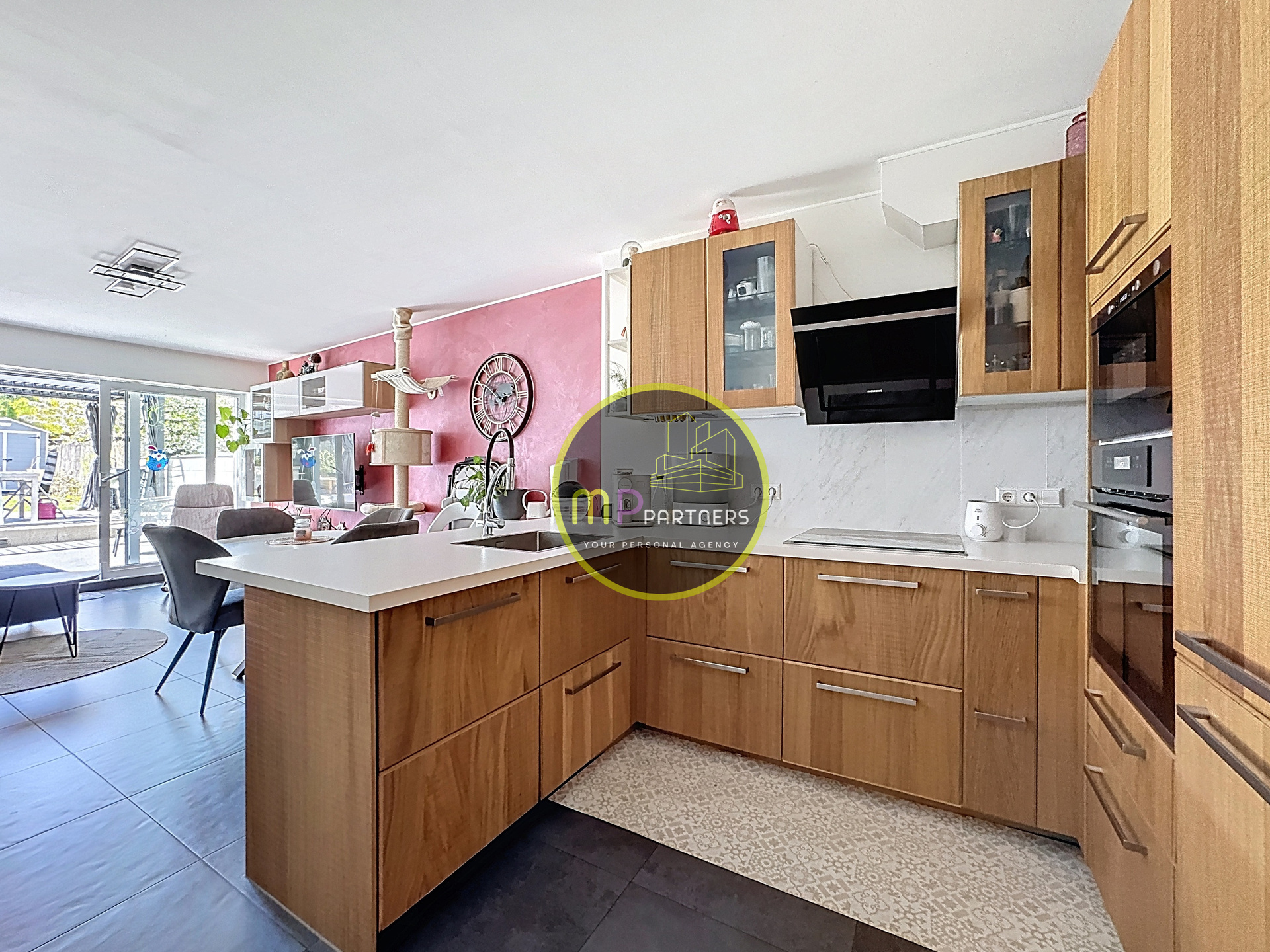 - Séjour de +/- 27.00m² avec cuisine ouverte donnant sur la terrasse et le jardin de +/- 55.00m²