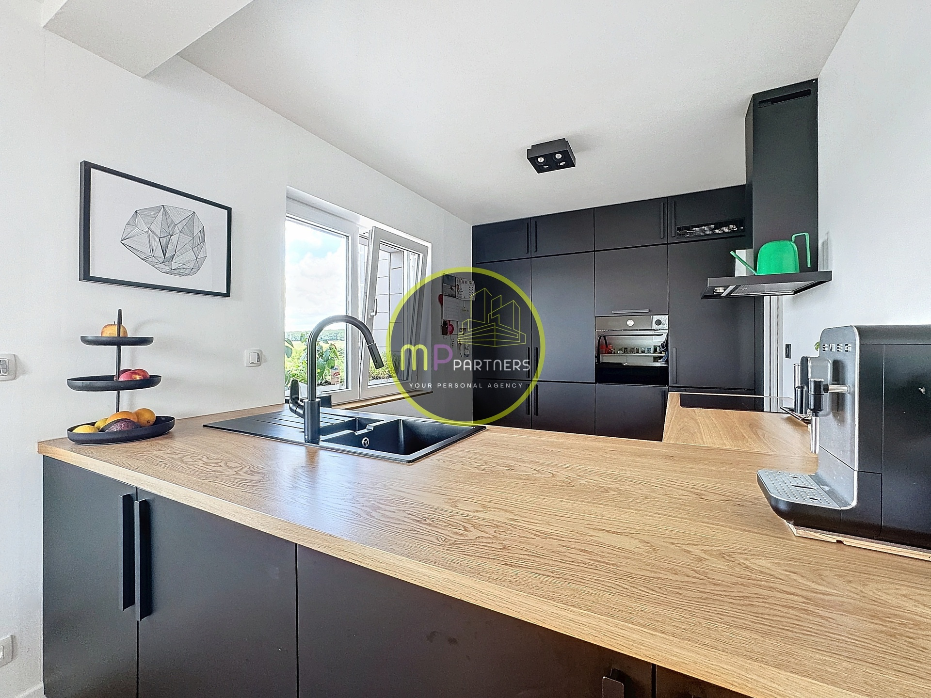 - Cuisine équipée sous garantie, semi-ouverte sur le séjour de +/- 8.60m²
